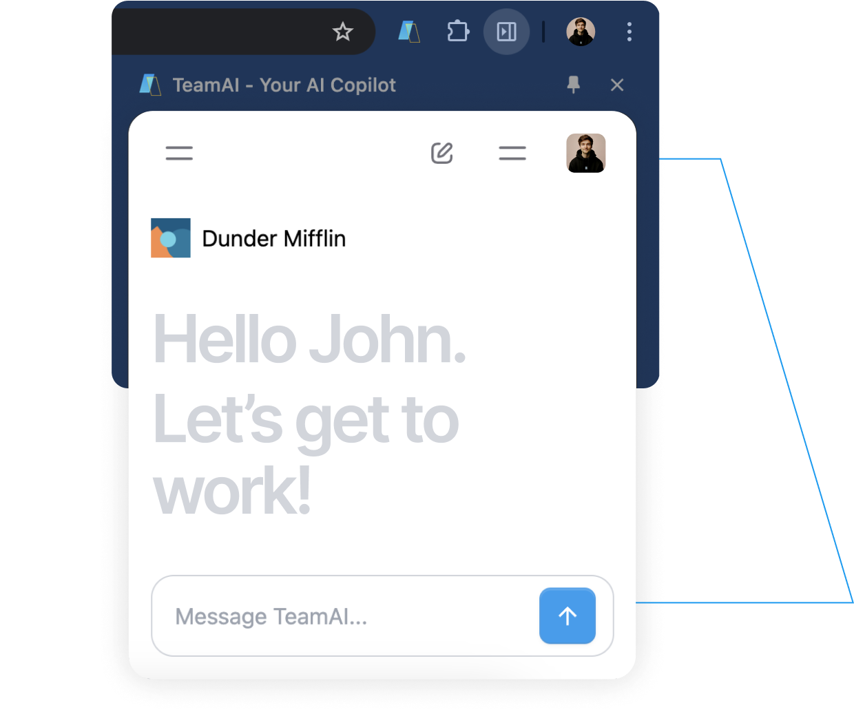 As you do your work, you may navigate between many tabs, which slows you down and disrupts your focus. The TeamAI Google Chrome extension allows you to reduce the number of open tabs by letting you use TeamAI in your current tab.